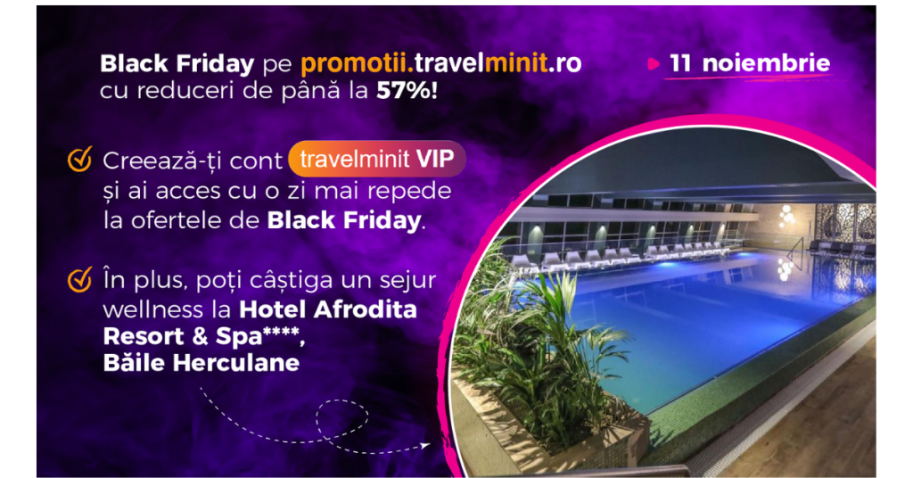 Iar dacă vrei să fii cu un pas înaintea tuturor, fă-ți cont Travelminit VIP și vei avea acces la cele mai bune oferte pe care le-am pregătit pentru tine cu o zi mai devreme! În plus, îți oferim șansa de câștiga un sejur de wellness la Hotel Afrodita Resort & Spa din stațiunea Băile Herculane! Mai multe detalii pe: https://travelminit.ro/promotii-travelminit-ro/black-friday-2022