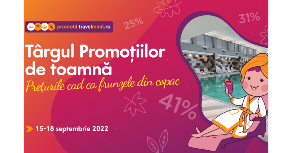 Toamna aceasta vine la pachet cu surprize și oferte de neratat de la Travelminit. Joi, 15 septembrie, dăm startul Târgului Promoțiilor de toamnă, astfel că ți-am pregătit pachete atractive, cu reducere de până la 41%, în toate destinațiile-hit ale sezonului, inclusiv la munte și la băi.
